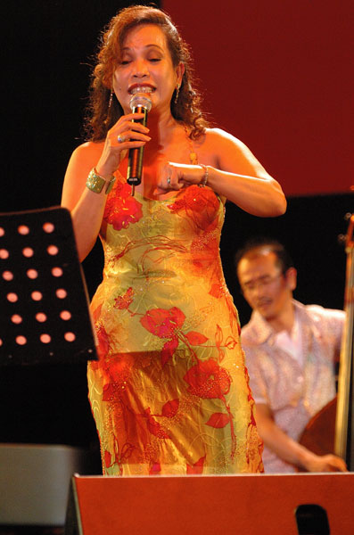 一日目、夜の部最初はチャリートが登場。 そのコスチュ−ムもさることながら、とてもカラフルなステージになりました。 Jazzのスタンダードをラテン風に演奏するJazzで、ディジー・ガレスピーがやっていたラテンJazzのな雰囲気を思い起こします。 チャリートは見た目は、ちょっと華奢ですが、声量は凄いです。 そして「尊敬するイヴァン・リンスの曲を歌います」とアナウンス・・・すると昼の部に出演したイヴァン・リンスが登場してチャリートとのデュエット。 これは思わぬハプニングですね。チャリートの「Dream Come True」ともらしたのはわかる気がします。 またボーカルを支えるバックも素晴らしく、特にトランペット原のハイノートには唸ってしまいました。(TKO) |