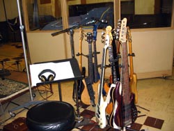 いよいよレコーディング初日、そういえばカリフォルニアだと言うのに天気がいまいちだ。どうも僕がLAに来ると天気が悪いらしい。(ちなみに僕が帰ってからすごく天気がよくなったらしい) 11時Oceanway Studioに集合で 、着いたのは10時半、David氏はもう来ていて、Drum Technicianがセッティングをほぼ終え、エンジニアのClarkと軽くサウンドチェックをしている。AbeのBassはすでに完璧にセッティングされていて、12本のベースがスタンドに立っている。
