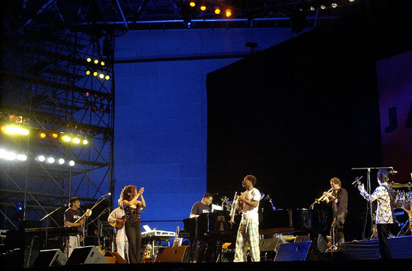 一日目、夜の部最初はチャリートが登場。 そのコスチュ−ムもさることながら、とてもカラフルなステージになりました。 Jazzのスタンダードをラテン風に演奏するJazzで、ディジー・ガレスピーがやっていたラテンJazzのな雰囲気を思い起こします。 チャリートは見た目は、ちょっと華奢ですが、声量は凄いです。 そして「尊敬するイヴァン・リンスの曲を歌います」とアナウンス・・・すると昼の部に出演したイヴァン・リンスが登場してチャリートとのデュエット。 これは思わぬハプニングですね。チャリートの「Dream Come True」ともらしたのはわかる気がします。 またボーカルを支えるバックも素晴らしく、特にトランペット原のハイノートには唸ってしまいました。(TKO) |